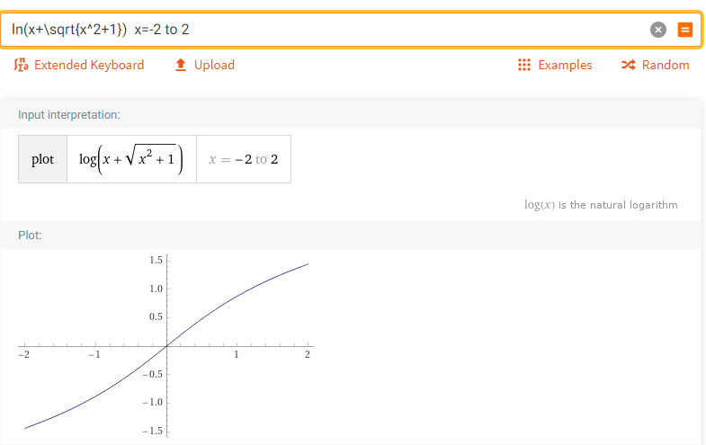 wolfram 发表于 2021-04-14 更新于 2021-06-14 阅读次数: 本文字数: 71 阅读时长 ≈ 1 分钟wolframalpha设置画图范围在函数图像上加上 x=min to maxln(x+\sqrt{x^2+1}) x=-2 to 2
