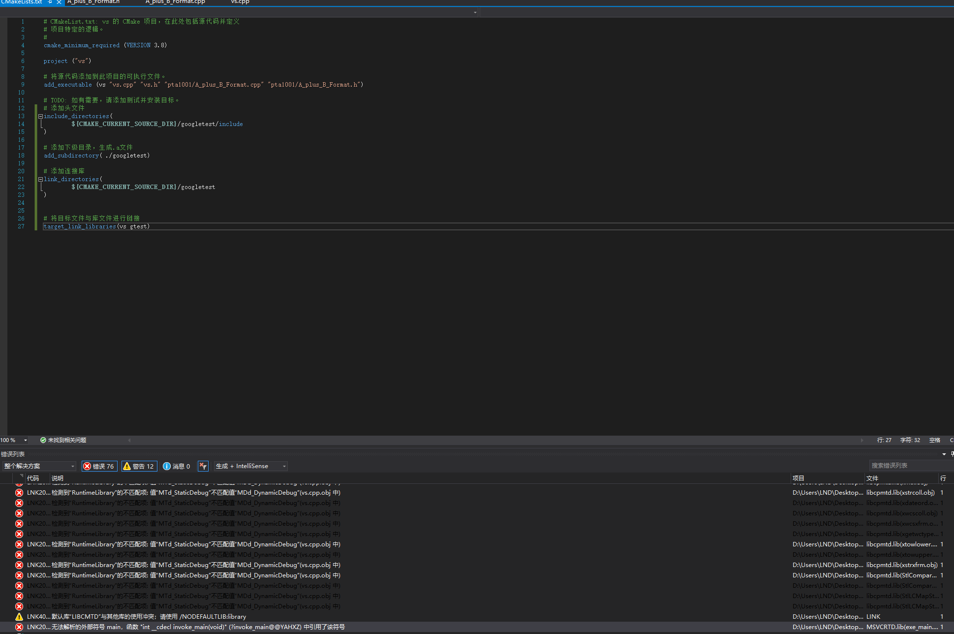 图片详情 bug 代码详情 1 2 3 4 5 6 7 8 9 10 11 12 13 14 15 16 17 18 19 20 21 22 23 24 25 26 27 28 29 30 31 32 33 34 35 36 37 38 39 40 41 42 43 44 45 ====================[ Build | untitled1 | Debug ]=============================== "C:\Program Files\JetBrains\CLion 2021.1.2\bin\cmake\win\bin\cmake.exe" --build C:\Users\lnd\CLionProjects\untitled1\cmake-build-debug --target untitled1 -- -j 9 [ 33%] Linking CXX executable untitled1.exe CMakeFiles\untitled1.dir/objects.a(main.cpp.obj): In function `main': C:/Users/lnd/CLionProjects/untitled1/main.cpp:7: undefined reference to `testing::InitGoogleTest(int*, char**)' CMakeFiles\untitled1.dir/objects.a(main.cpp.obj): In function `RUN_ALL_TESTS()': C:/PROGRA~1/MINGW-~1/X86_64~1.0-W/mingw64/lib/gcc/x86_64-w64-mingw32/8.1.0/include/c++/gtest/gtest.h:2490: undefined reference to `testing::UnitTest::GetInstance()' C:/PROGRA~1/MINGW-~1/X86_64~1.0-W/mingw64/lib/gcc/x86_64-w64-mingw32/8.1.0/include/c++/gtest/gtest.h:2490: undefined reference to `testing::UnitTest::Run()' CMakeFiles\untitled1.dir/objects.a(MaximalClique.cpp.obj): In function `PTA_1142_Test::TestBody()': C:/Users/lnd/CLionProjects/untitled1/PTA/PTA1142/MaximalClique.cpp:135: undefined reference to `testing::Message::Message()' C:/Users/lnd/CLionProjects/untitled1/PTA/PTA1142/MaximalClique.cpp:135: undefined reference to `testing::internal::AssertHelper::AssertHelper(testing::TestPartResult::Type, char const*, int, char const*)' C:/Users/lnd/CLionProjects/untitled1/PTA/PTA1142/MaximalClique.cpp:135: undefined reference to `testing::internal::AssertHelper::operator=(testing::Message const&) const' C:/Users/lnd/CLionProjects/untitled1/PTA/PTA1142/MaximalClique.cpp:135: undefined reference to `testing::internal::AssertHelper::~AssertHelper()' C:/Users/lnd/CLionProjects/untitled1/PTA/PTA1142/MaximalClique.cpp:135: undefined reference to `testing::internal::AssertHelper::~AssertHelper()' CMakeFiles\untitled1.dir/objects.a(MaximalClique.cpp.obj): In function `__static_initialization_and_destruction_0': C:/Users/lnd/CLionProjects/untitled1/PTA/PTA1142/MaximalClique.cpp:134: undefined reference to `testing::internal::GetTestTypeId()' C:/Users/lnd/CLionProjects/untitled1/PTA/PTA1142/MaximalClique.cpp:134: undefined reference to `testing::internal::MakeAndRegisterTestInfo(char const*, char const*, char const*, char const*, testing::internal::CodeLocation, void const*, void (*)(), void (*)(), testing::internal::TestFactoryBase*)' CMakeFiles\untitled1.dir/objects.a(MaximalClique.cpp.obj): In function `testing::internal::PrintTo(std::__cxx11::basic_string<char, std::char_traits<char>, std::allocator<char> > const&, std::ostream*)': C:/PROGRA~1/MINGW-~1/X86_64~1.0-W/mingw64/lib/gcc/x86_64-w64-mingw32/8.1.0/include/c++/gtest/gtest-printers.h:550: undefined reference to `testing::internal::PrintStringTo(std::__cxx11::basic_string<char, std::char_traits<char>, std::allocator<char> > const&, std::ostream*)' CMakeFiles\untitled1.dir/objects.a(MaximalClique.cpp.obj): In function `testing::internal::SuiteApiResolver<testing::Test>::GetSetUpCaseOrSuite(char const*, int)': C:/PROGRA~1/MINGW-~1/X86_64~1.0-W/mingw64/lib/gcc/x86_64-w64-mingw32/8.1.0/include/c++/gtest/internal/gtest-internal.h:529: undefined reference to `testing::internal::IsTrue(bool)' C:/PROGRA~1/MINGW-~1/X86_64~1.0-W/mingw64/lib/gcc/x86_64-w64-mingw32/8.1.0/include/c++/gtest/internal/gtest-internal.h:529: undefined reference to `testing::internal::GTestLog::GTestLog(testing::internal::GTestLogSeverity, char const*, int)' C:/PROGRA~1/MINGW-~1/X86_64~1.0-W/mingw64/lib/gcc/x86_64-w64-mingw32/8.1.0/include/c++/gtest/internal/gtest-internal.h:529: undefined reference to `testing::internal::GTestLog::~GTestLog()' C:/PROGRA~1/MINGW-~1/X86_64~1.0-W/mingw64/lib/gcc/x86_64-w64-mingw32/8.1.0/include/c++/gtest/internal/gtest-internal.h:529: undefined reference to `testing::internal::GTestLog::~GTestLog()' CMakeFiles\untitled1.dir/objects.a(MaximalClique.cpp.obj): In function `testing::internal::SuiteApiResolver<testing::Test>::GetTearDownCaseOrSuite(char const*, int)': C:/PROGRA~1/MINGW-~1/X86_64~1.0-W/mingw64/lib/gcc/x86_64-w64-mingw32/8.1.0/include/c++/gtest/internal/gtest-internal.h:550: undefined reference to `testing::internal::IsTrue(bool)' C:/PROGRA~1/MINGW-~1/X86_64~1.0-W/mingw64/lib/gcc/x86_64-w64-mingw32/8.1.0/include/c++/gtest/internal/gtest-internal.h:550: undefined reference to `testing::internal::GTestLog::GTestLog(testing::internal::GTestLogSeverity, char const*, int)' C:/PROGRA~1/MINGW-~1/X86_64~1.0-W/mingw64/lib/gcc/x86_64-w64-mingw32/8.1.0/include/c++/gtest/internal/gtest-internal.h:550: undefined reference to `testing::internal::GTestLog::~GTestLog()' C:/PROGRA~1/MINGW-~1/X86_64~1.0-W/mingw64/lib/gcc/x86_64-w64-mingw32/8.1.0/include/c++/gtest/internal/gtest-internal.h:550: undefined reference to `testing::internal::GTestLog::~GTestLog()' CMakeFiles\untitled1.dir/objects.a(MaximalClique.cpp.obj): In function `testing::AssertionResult testing::internal::CmpHelperEQ<std::__cxx11::basic_string<char, std::char_traits<char>, std::allocator<char> >, std::__cxx11::basic_string<char, std::char_traits<char>, std::allocator<char> > >(char const*, char const*, std::__cxx11::basic_string<char, std::char_traits<char>, std::allocator<char> > const&, std::__cxx11::basic_string<char, std::char_traits<char>, std::allocator<char> > const&)': C:/PROGRA~1/MINGW-~1/X86_64~1.0-W/mingw64/lib/gcc/x86_64-w64-mingw32/8.1.0/include/c++/gtest/gtest.h:1546: undefined reference to `testing::AssertionSuccess()' CMakeFiles\untitled1.dir/objects.a(MaximalClique.cpp.obj): In function `testing::AssertionResult testing::internal::CmpHelperEQFailure<std::__cxx11::basic_string<char, std::char_traits<char>, std::allocator<char> >, std::__cxx11::basic_string<char, std::char_traits<char>, std::allocator<char> > >(char const*, char const*, std::__cxx11::basic_string<char, std::char_traits<char>, std::allocator<char> > const&, std::__cxx11::basic_string<char, std::char_trait